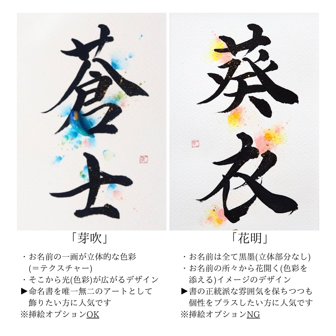 ※お名前の一画を立体的な色彩で表現するため、デザイン性の高い命名書となっております。アート作品として飾りたい方におすすめです。逆にお名前を全て墨ではっきりさせたい等ご希望の方は、デザイン違いの「花明」をお選びください。